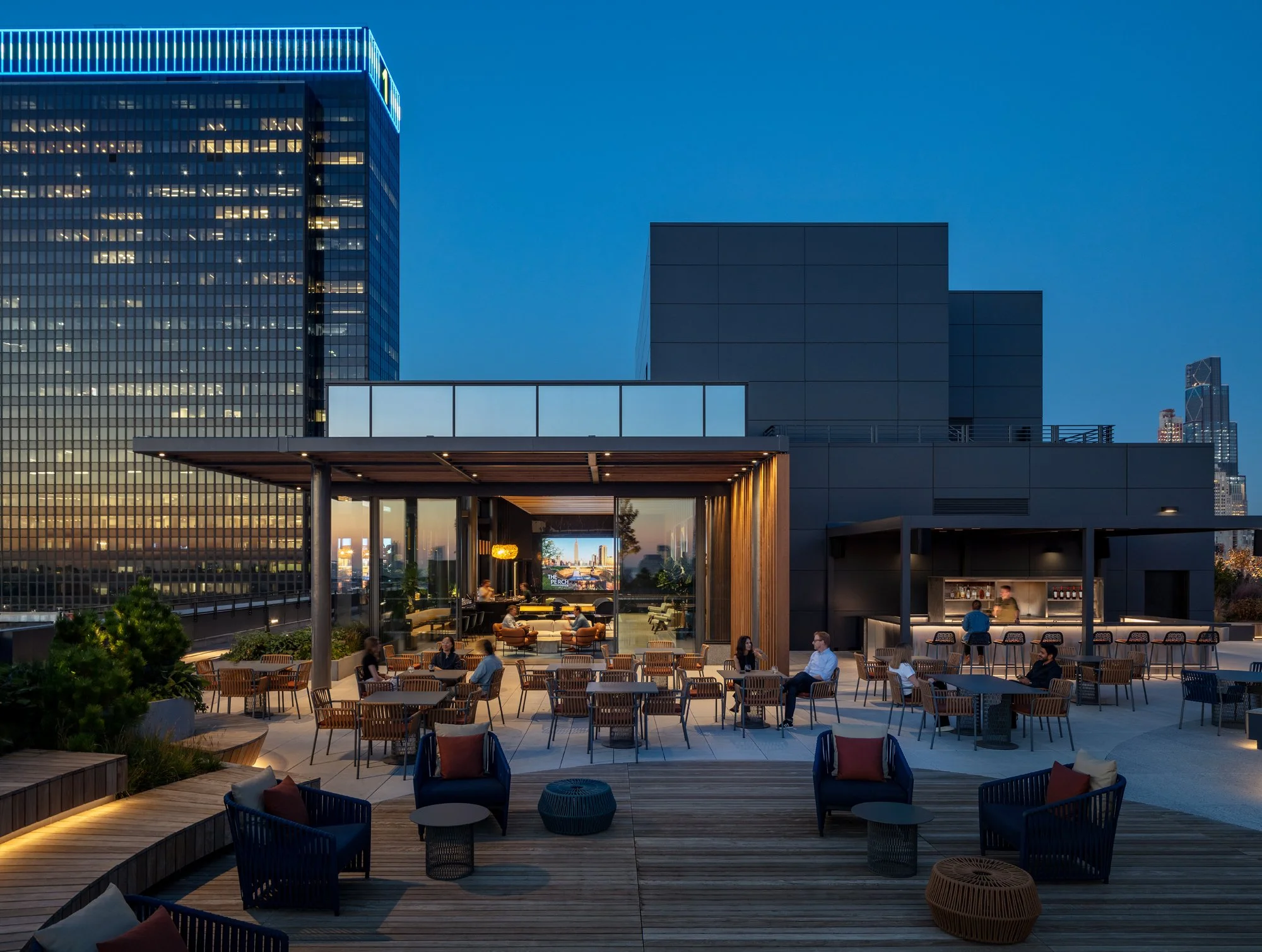 At the top of the building, the elevators were extended to access a new multi-functional roof pavilion and 17,000 square foot roof park. Named for the restored eagle which once perched on the historic Pennsylvania Station, The Perch serves as a flexible amenity for tenants and rentable event space, complete with bar, grilling station, indoor/outdoor seating, and integrated sound and lighting.