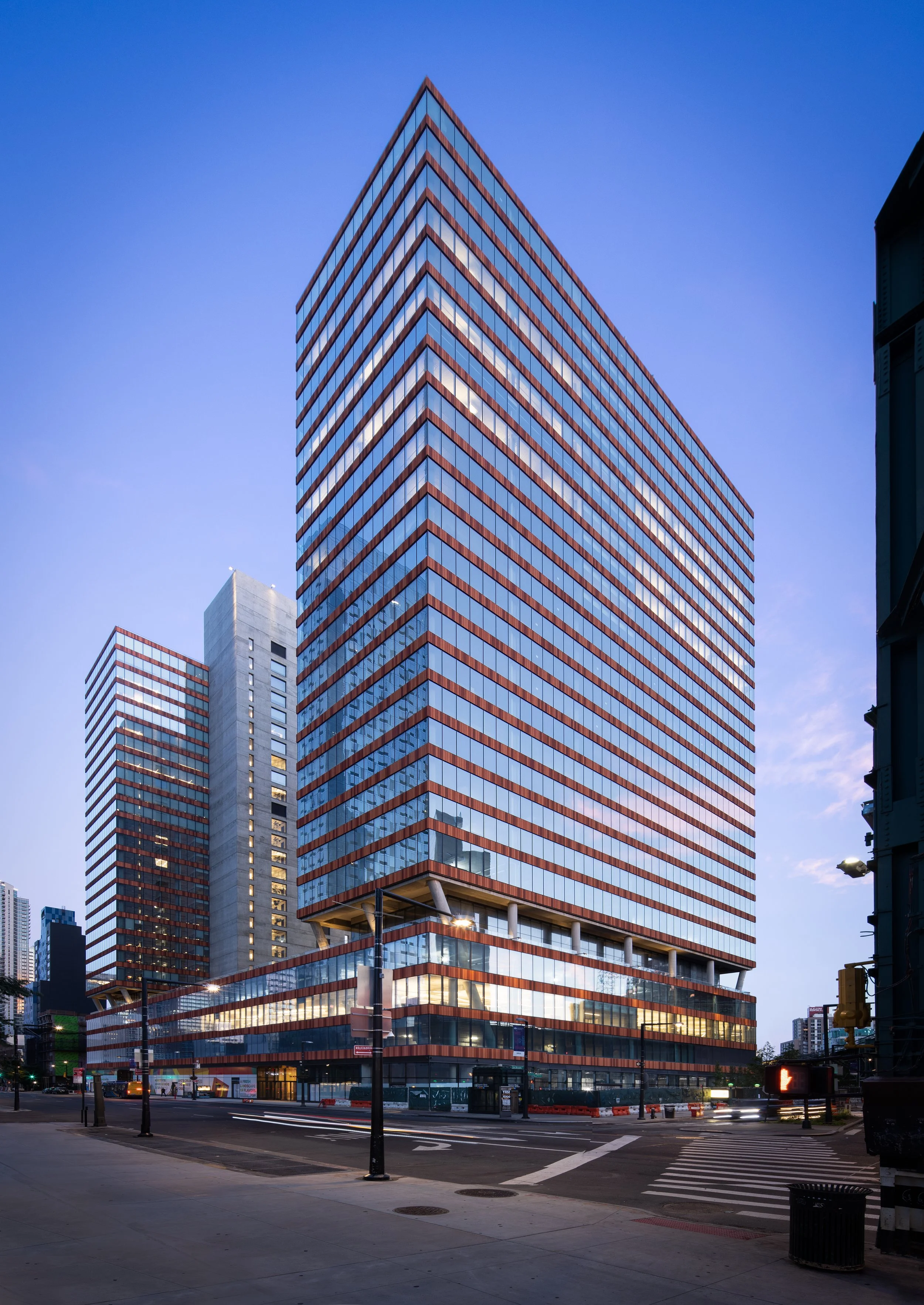 The JACX is characterized by two identical 26-story towers featuring raw concrete and textured, earth-colored terracotta panels that are reminiscent of the area’s brick industrial context. The towers meet at the 5th floor where the building’s sloping concrete columns are exposed, characterizing a generous outdoor terrace that connects the two towers atop the lower podium. At the street level there is a public plaza, gourmet market, food hall, fine dining restaurant, outpatient hospital, and a boutique fitness center that serve the mixed-use neighborhood. These offerings amplify the culture and lifestyle of those who live in LIC, while the design of the upper floors pioneers modern work culture for those that call it their office.